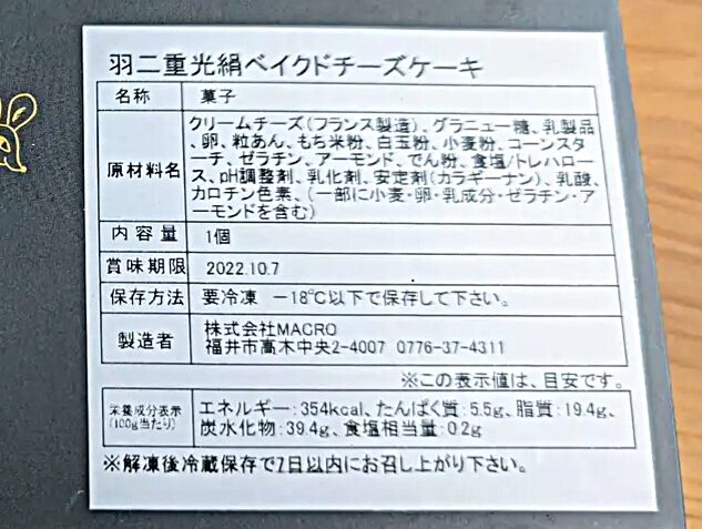原材料名クリームチーズ(フランス製造)、グラニュー糖、乳製品、卵、粒あん、もち米粉、白玉粉、小麦粉、コーンスターチ、ゼラチン、アーモンド、でん粉、食塩/トレハロース、pH調整剤、乳化剤、安定剤(カラギーナン)、乳酸、カロテン色素、(一部に小麦・卵・乳成分・ゼラチン・アーモンドを含む)